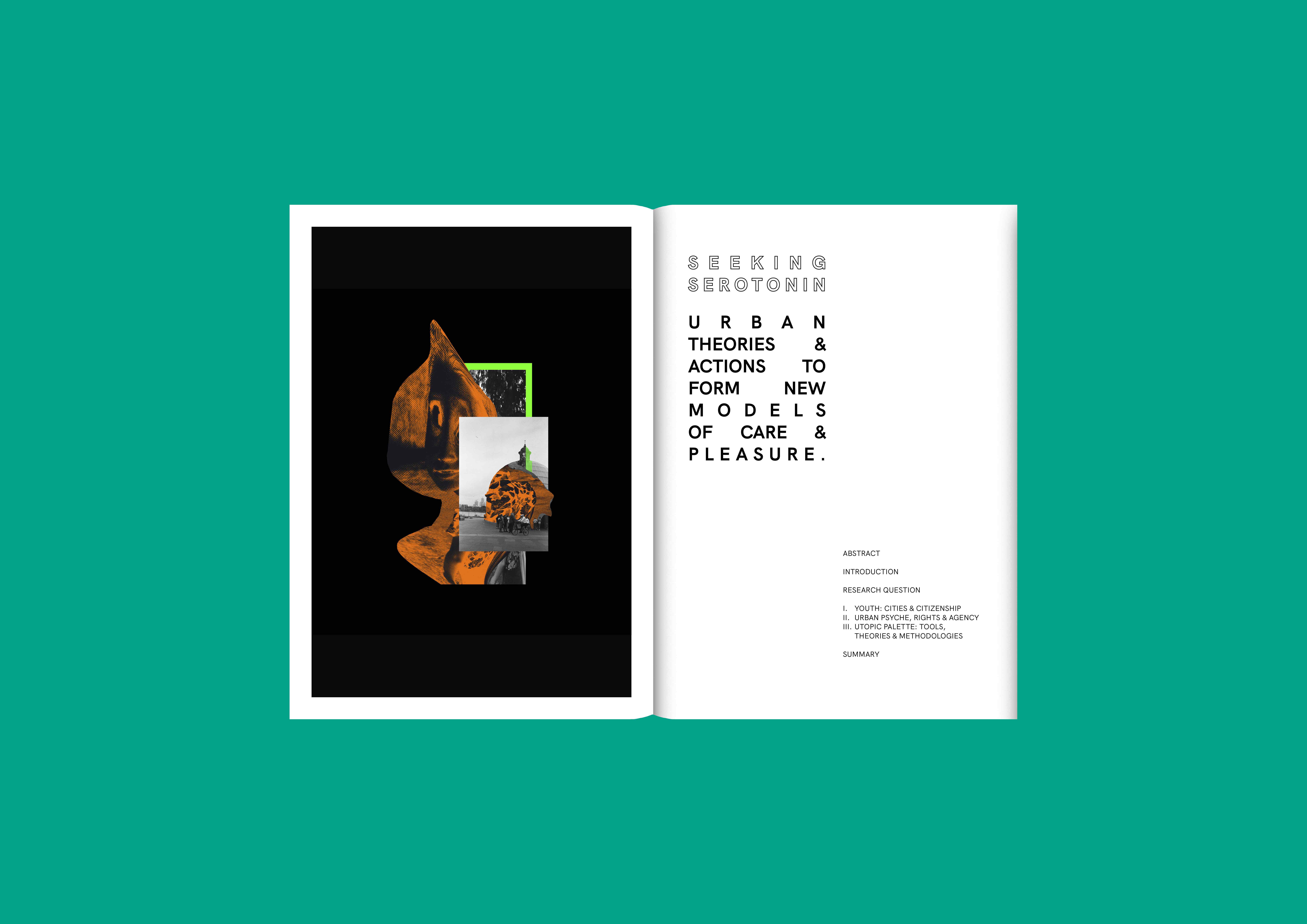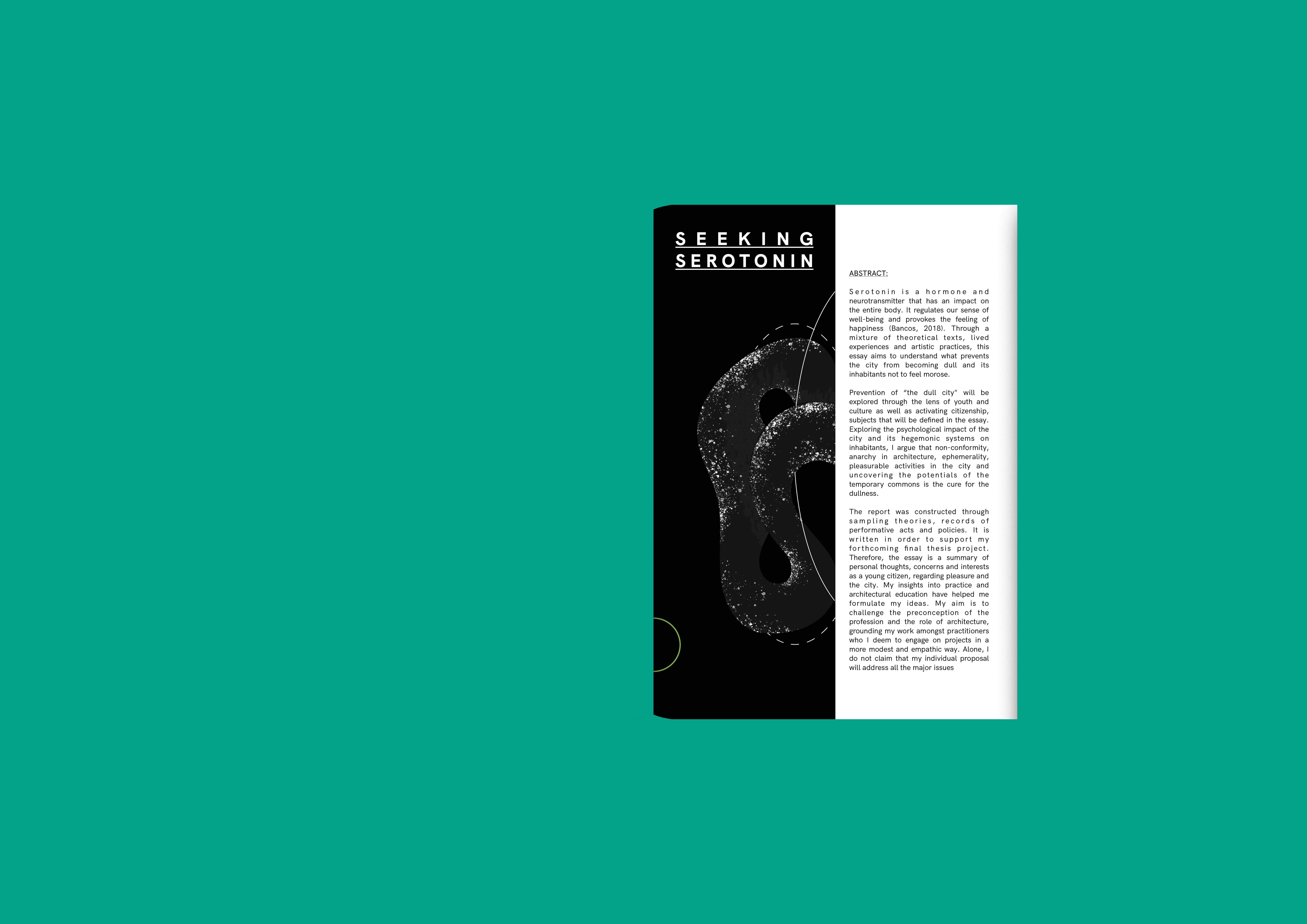 Seeking Serotonin is a specialist research essay that illustrates my interests and position within the architectural profession. In this essay, I explore the topics of youth, citizenship, culture and pleasure. My research question aims to save the city from becoming dull and create new cycles of care.